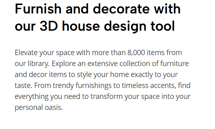 Don’t forget to check out the library filled with furniture and decor items. Selecting pieces that match your aesthetic is simple and fun.